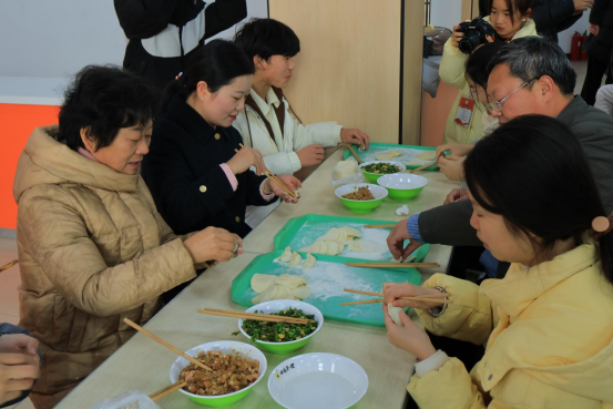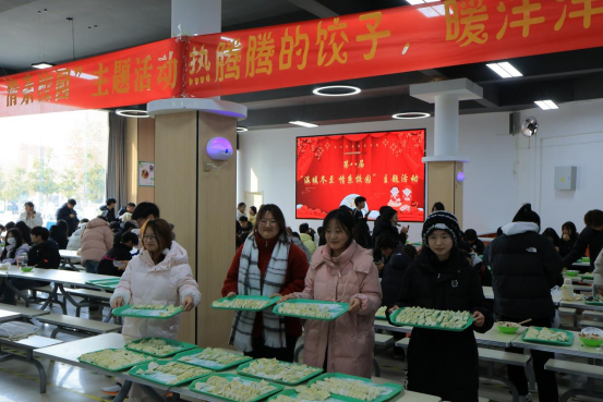 师生欢聚一堂,现场气氛融洽,餐厅工作人员提前准备好饺子皮、馅料等食材,同学们纷纷撸起袖子,相互切磋包饺子技巧,在协作中增进了友谊,增强了团队凝聚力与合作精神。