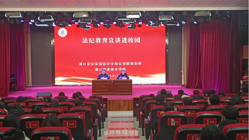 为深入推进习近平总书记对河南重要指示批示精神贯彻落实,进一步提高大学生法律意识和纪律观念,营造文明、平安、和谐的校园环境,2月21日下午,学校保卫处、学生处联合周口市公安局经开分局太昊路派出所在我校艺术演播厅开展法纪教育宣讲进校园活动,180余名学生干部参加活动。