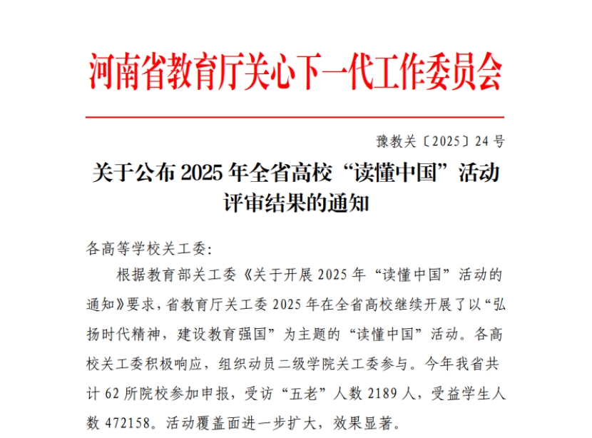 近日,河南省教育厅关心下一代工作委员会公布2025年“读懂中国”活动评审结果,我校荣获征文一等奖和活动表扬单位,充分展现出学校依托“大思政课”实践育人平台,推动思政教育走深走实的良好成效。