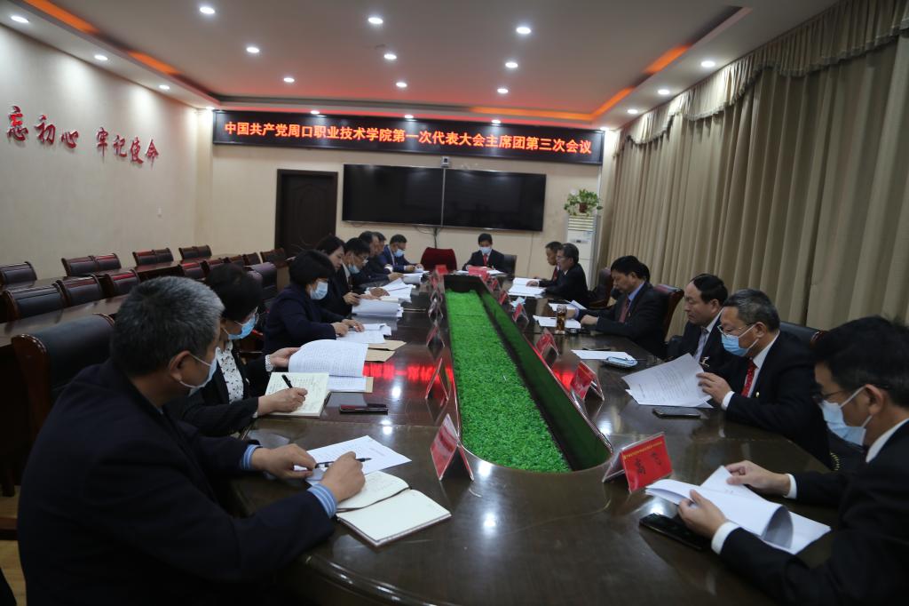 10月9日15时30分,中国共产党周口职业技术学院第一次代表大会主席团在开元校区行政楼第三会议室举行第三次会议。校党委书记刘士欣主持会议。