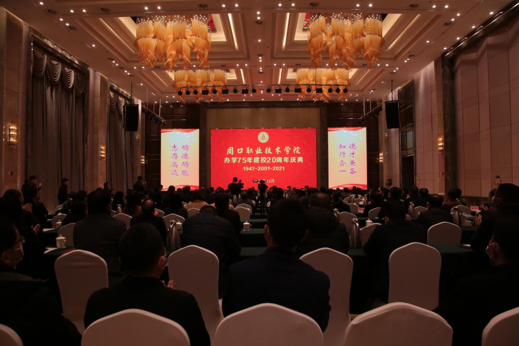七十五年弦歌不辍,薪火相传;二十载砥砺奋进,春华秋实。2021年12月18日上午,我校隆重举行办学75年建校20周年庆祝活动。周口市委常委、宣传部部长王少青,周口市人大常委会副主任建志,周口市人民政府副市长秦胜军,周口市政协副主席杨珺,河南科技职业大学党委书记王剑,河南省政府参事、驻马店市原副市长张德轩,周口市人大常委会原副主任解冰山,周口职业技术学院原党委书记李松海,周口职业技术学院原校长张卫宪出席活动。出席活动的还有全体校领导,周口市直部分单位的领导,学校部分历任领导,市内兄弟院校的领导,部分知名校友。校长李清臣主持会议。