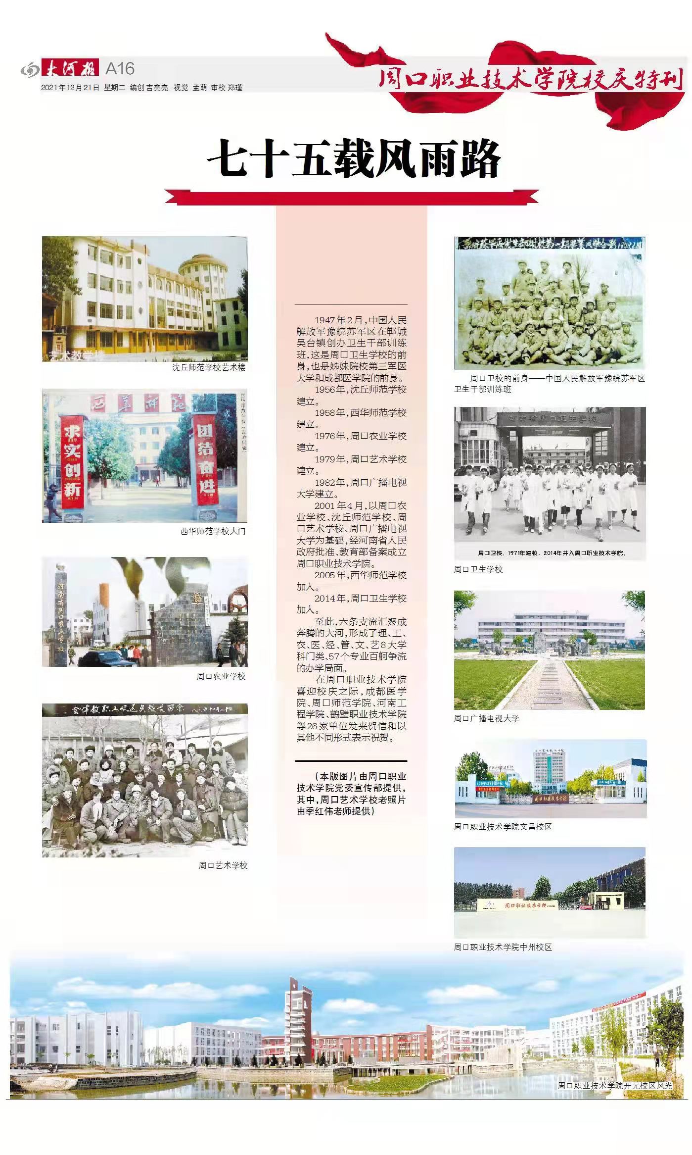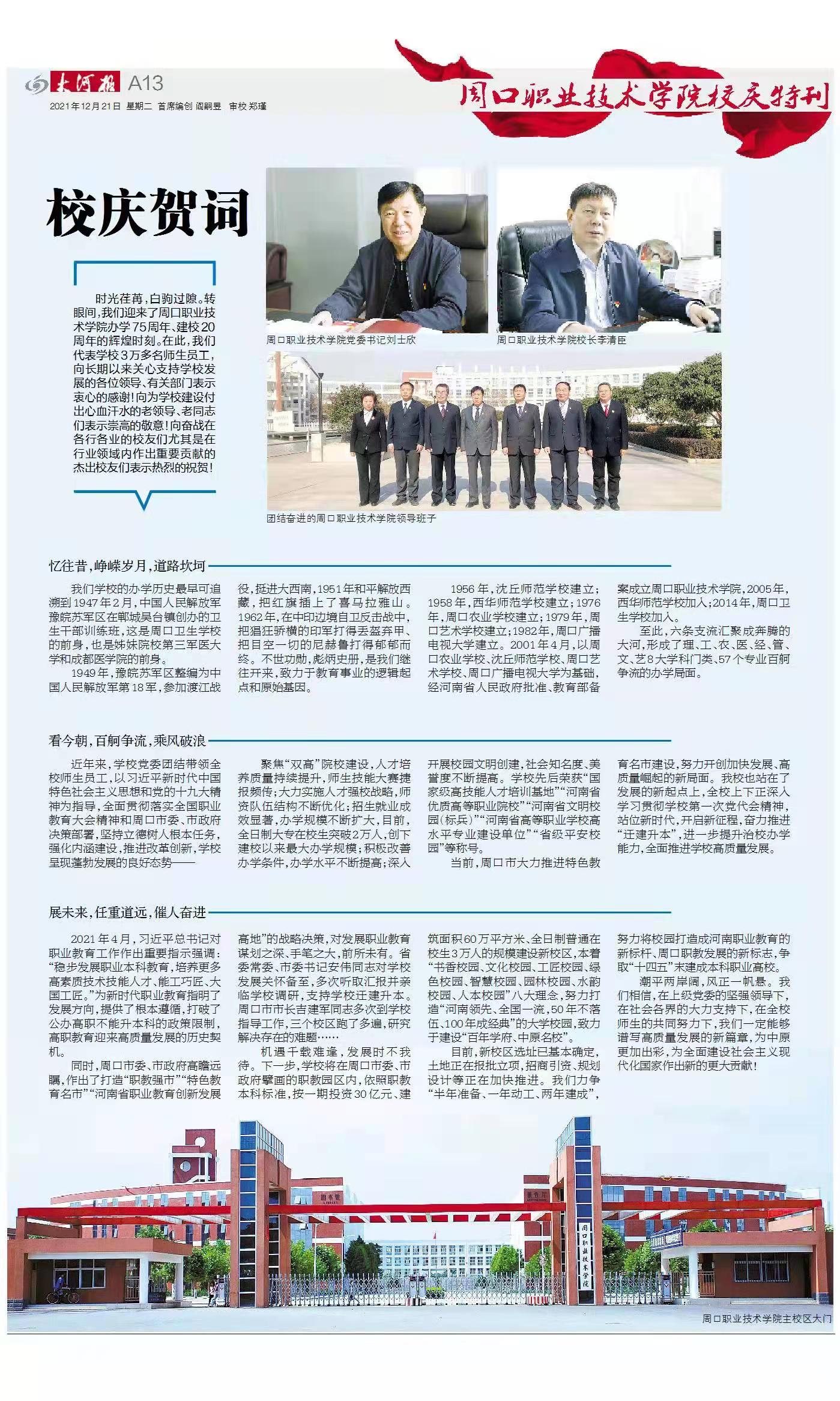 本次校庆特刊,由我校党委宣传部联合大河报周口运营中心策划实施。校庆活动开始前,我校宣传部工作人员多次与大河报周口运营中心沟通,就特刊采写、制作细节等进行深入细致地研究商讨,以求宣传效果走实、走心、入脑,达到润物无声、聚焦出彩的效果。